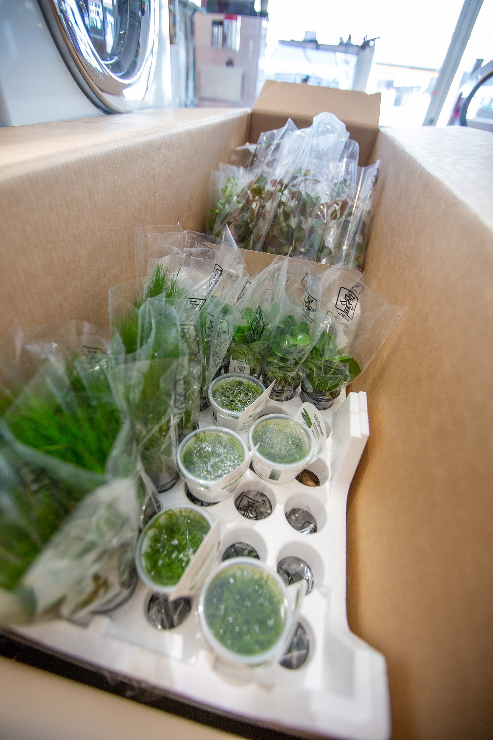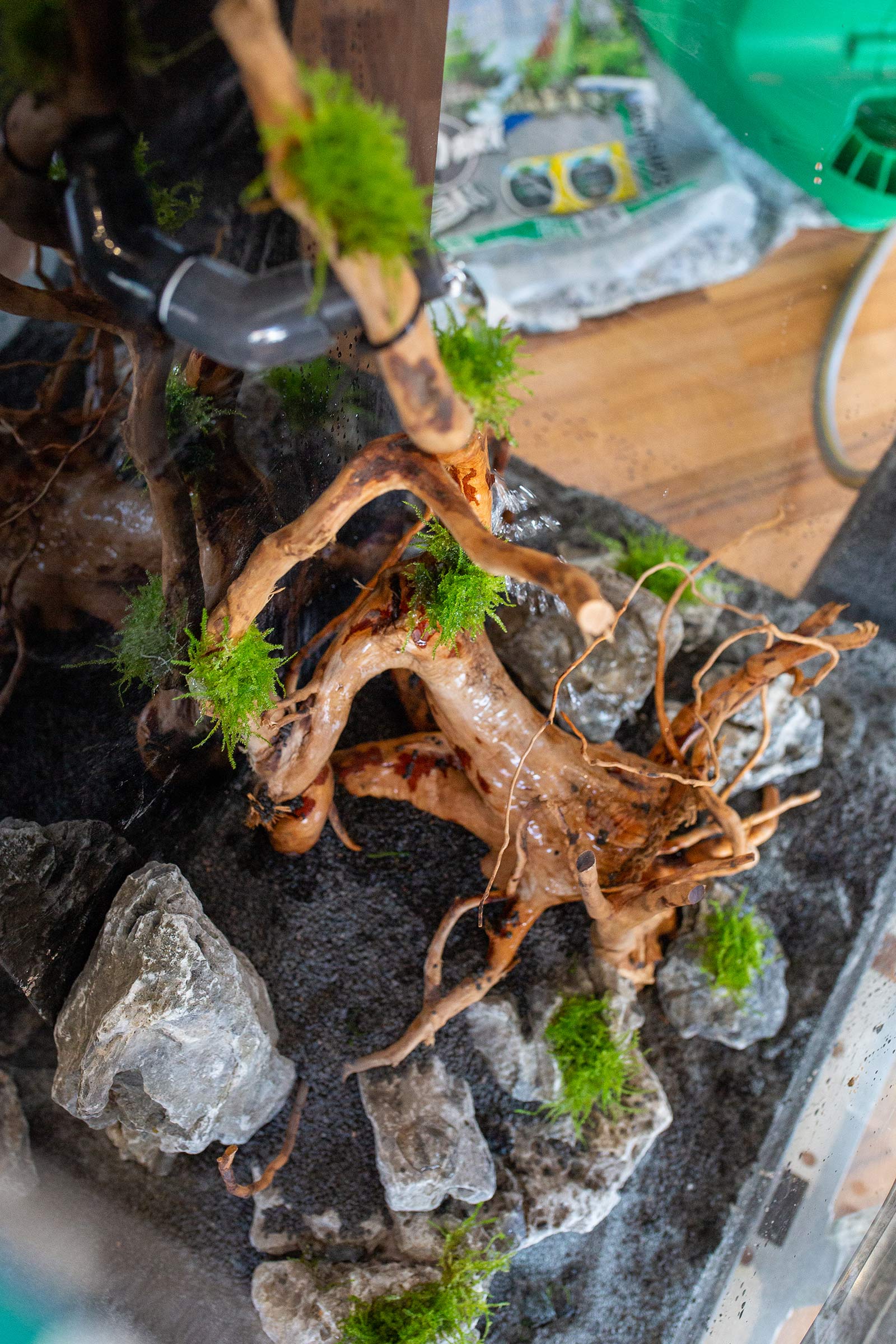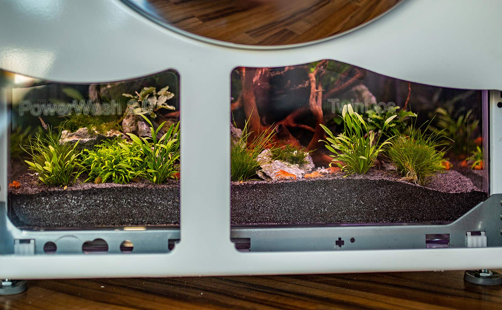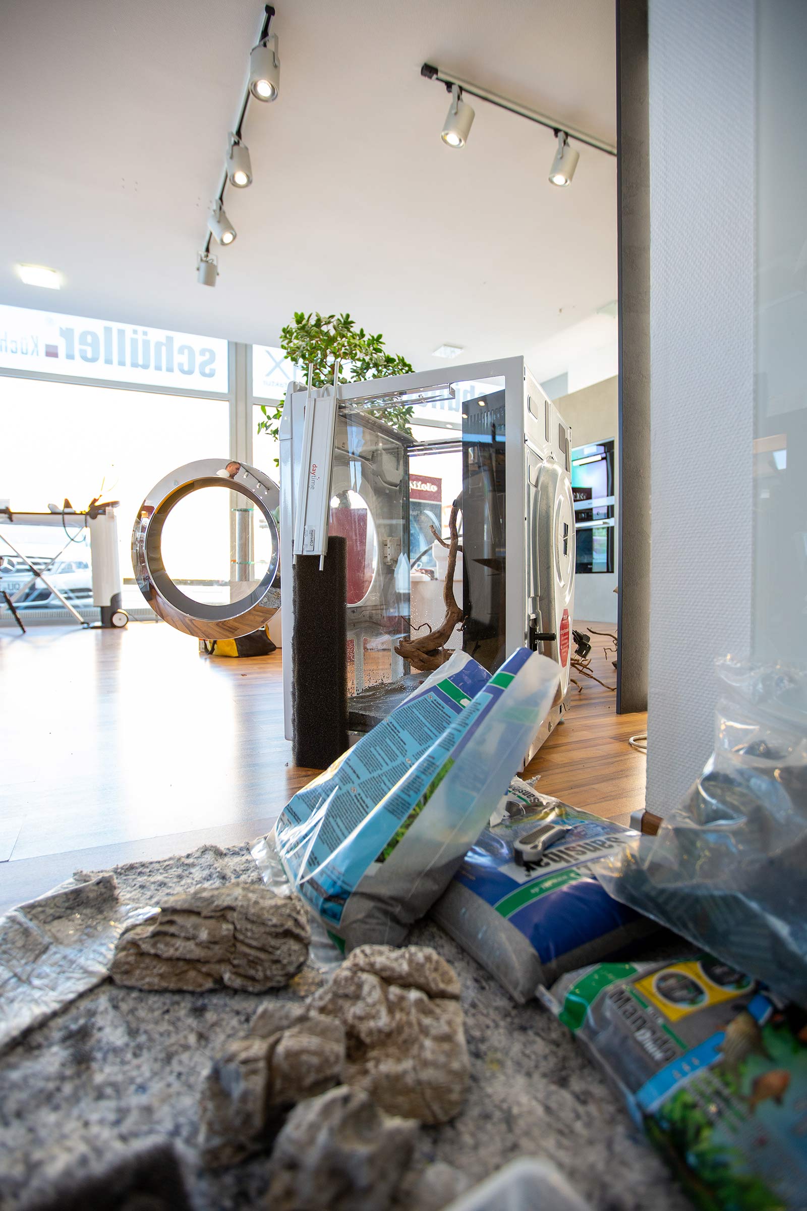 The display aquarium in a Miele store in Aachen is a real showstopper. It's not only fascinating to look at but also boasts maximum functionality. Integrated internal filter and aquarium lighting guarantee sufficient filter performance. The underwater world consists of one type of moss and nine different aquatic plant species, which replicate a riverbank area in terms of planting arrangement, expected growth and different plant heights. Various natural hiding places and boundaries were created using bogwood and mini landscaping rock.