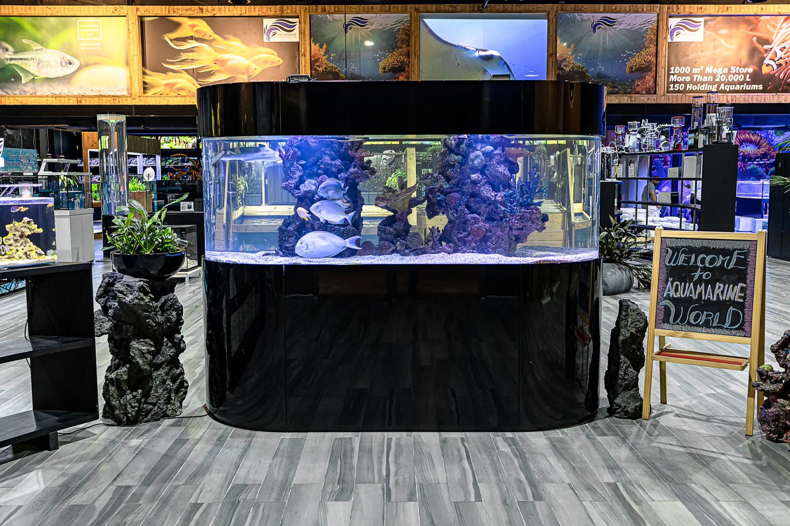 This project allowed us to collaborate with our friends and partners www.aquamarineexotic.com on their new aquatics megastore in the heart of Kuwait City and engage in all aspects of aquarium design. The project included a 400-litre freshwater cylinder aquarium, a bespoke 2500-litre seawater aquarium integrated into an exclusive designer unit, a steel-reinforced GFRP aquarium with front glazing consisting of a 60-mm-thick acrylic panel, an artificial mangrove rear wall and two 2-m-high water features.