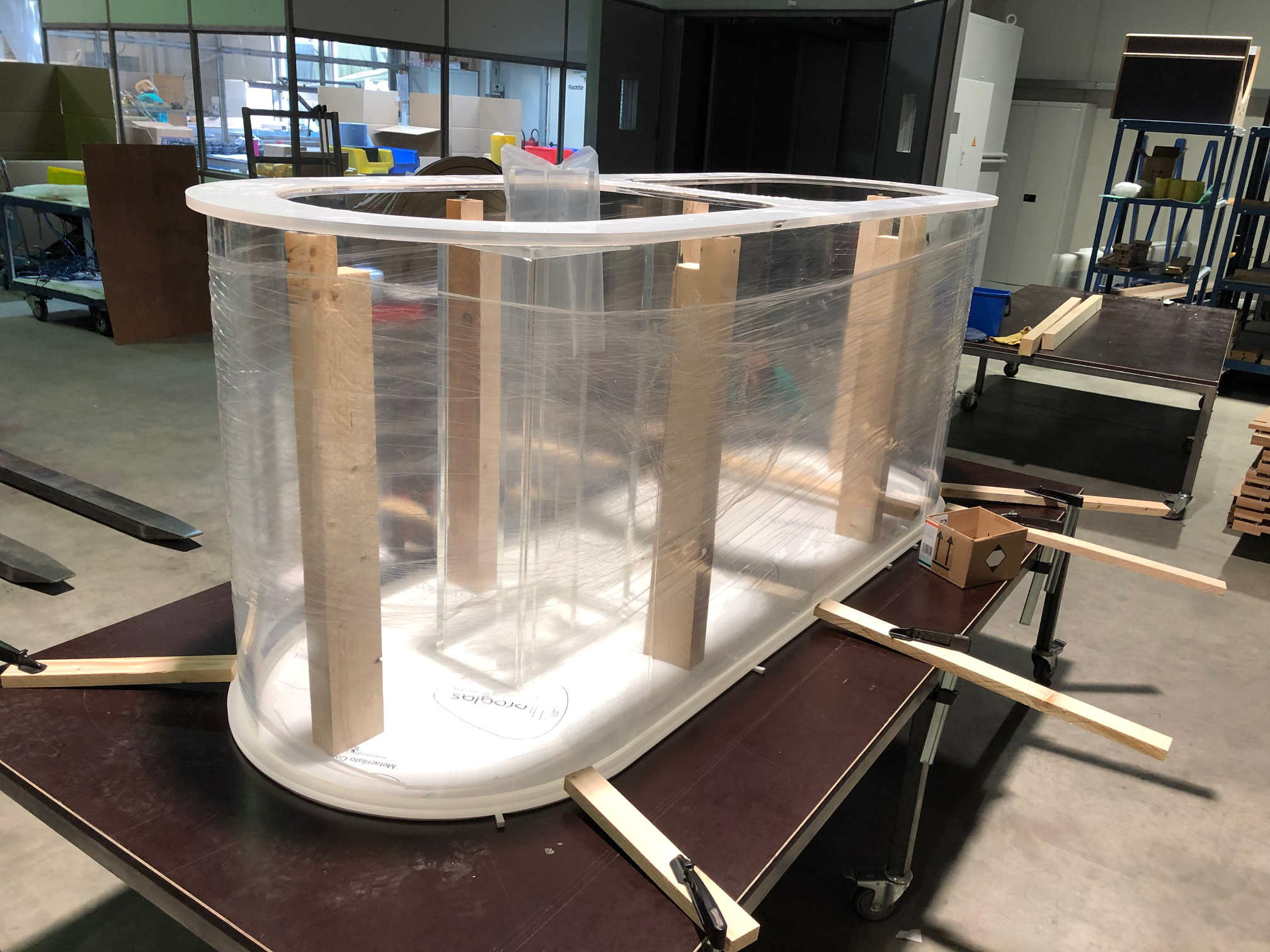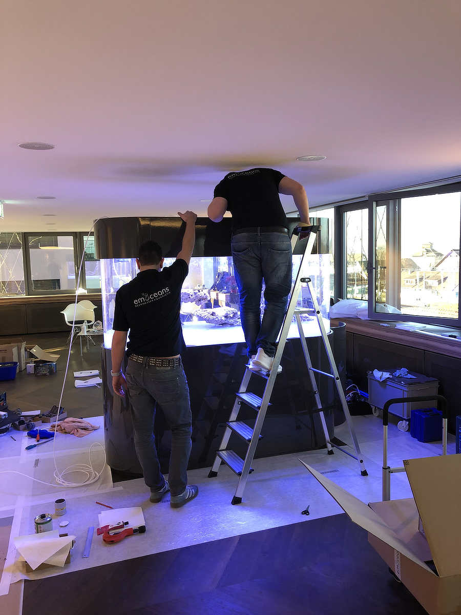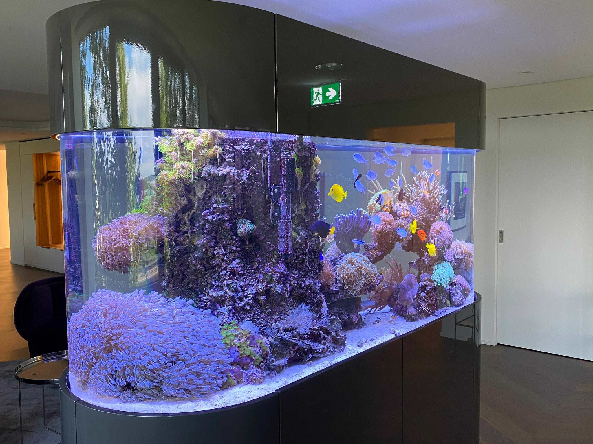 In cooperation with Emoceans of Switzerland, this exclusive display aquarium was created for the waiting area of the Vista Klinik in Pfäffikon overlooking Lake Zürich. With its rounded end walls, the tanks appears almost infinite. Incorporated into a high-gloss lacquered unit, an elegant feature is created that blends in optimally with the rest of the clinic's sophisticated interior design.