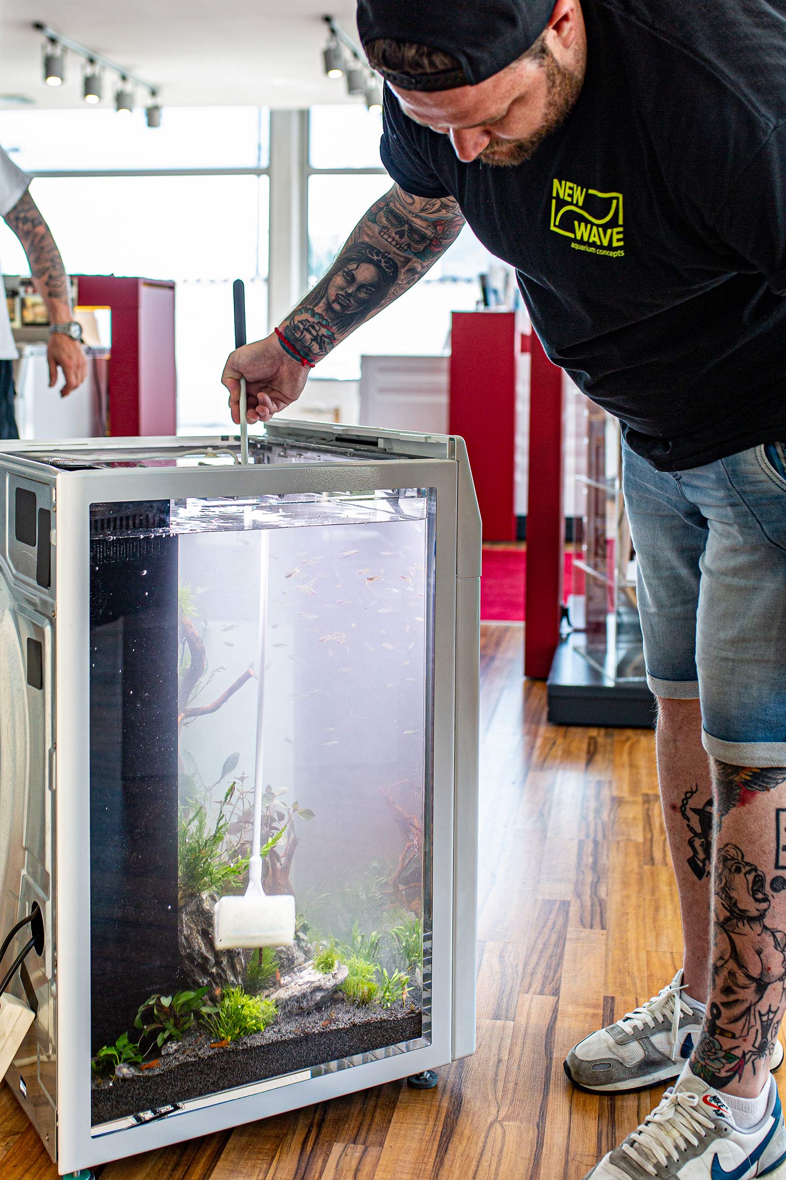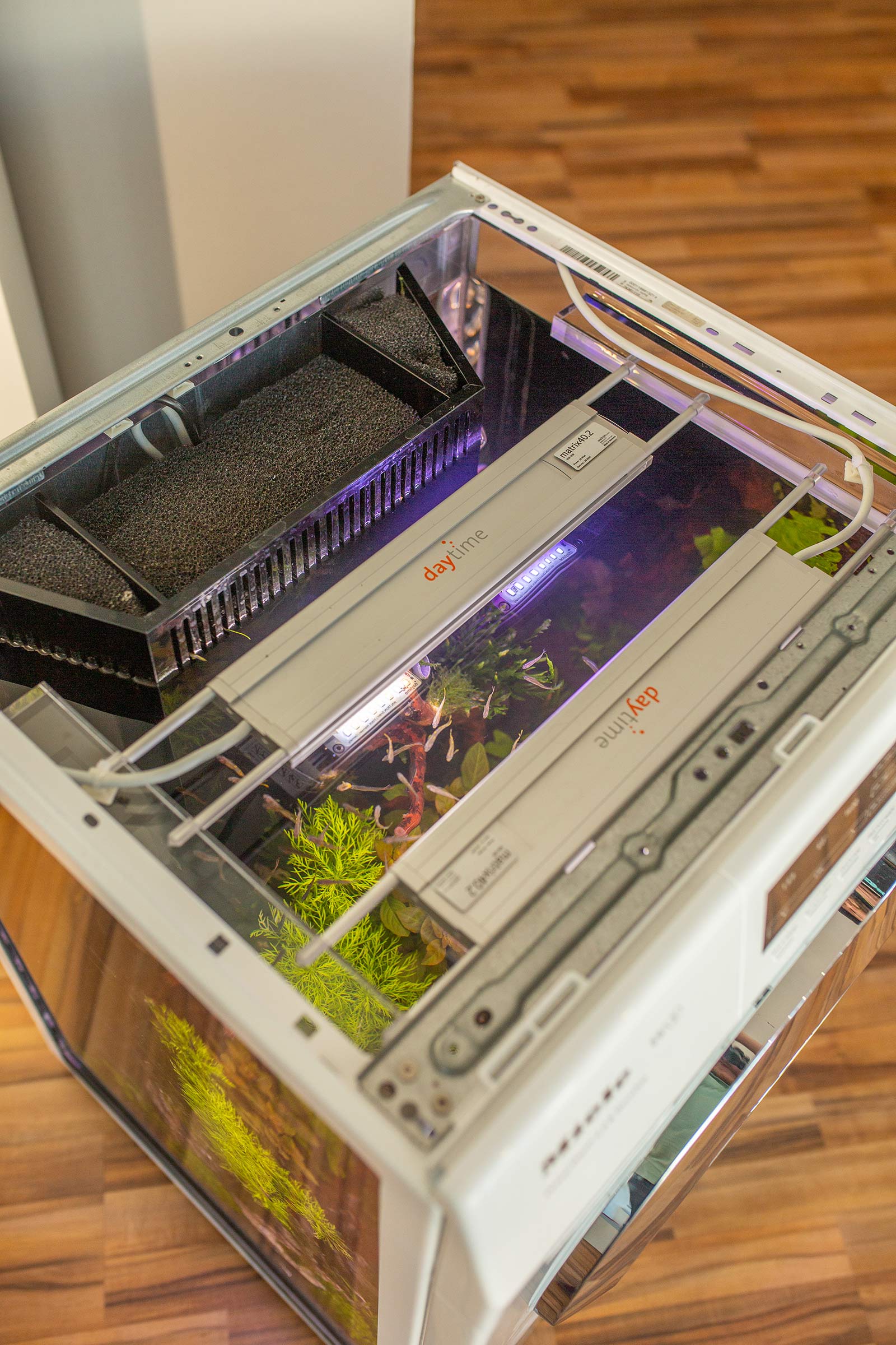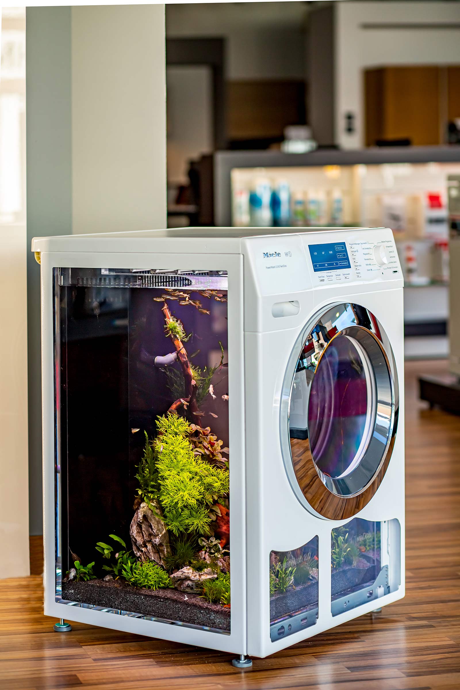 Das Schauaquarium in einem Miele-Store in Aachen ist ein wahrer Eyecatcher. Es besticht nicht nur durch seine Optik, sondern ebenso durch seine hohe Funktionalität. Ein integrierter Innenfilter und Aquarienbeleuchtung sorgen für eine ausreichende Filterleistung. Die Unterwasserwelt besteht aus neun verschiedenen Wasserpflanzenarten und einer Moosart, die in der Art der Bepflanzung und ihrer zukünftigen Wuchsform und Höhenunterschieden einen Uferbereich simulieren. Diverse natürliche Verstecke und Revierabgrenzungen wurden durch Moorhölzer und Minilandschaftsgestein realisiert.