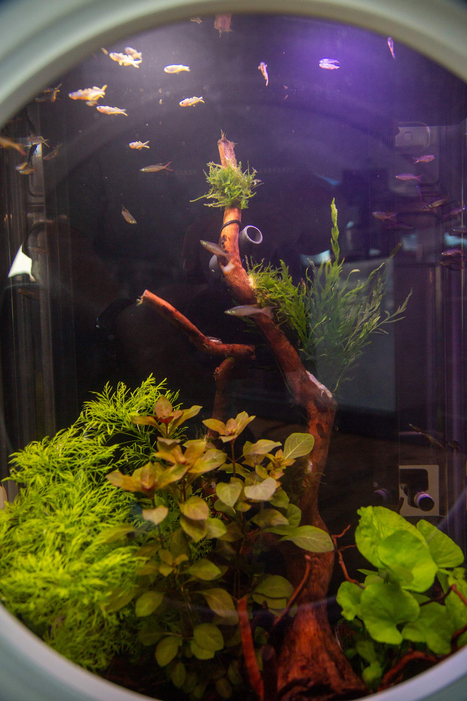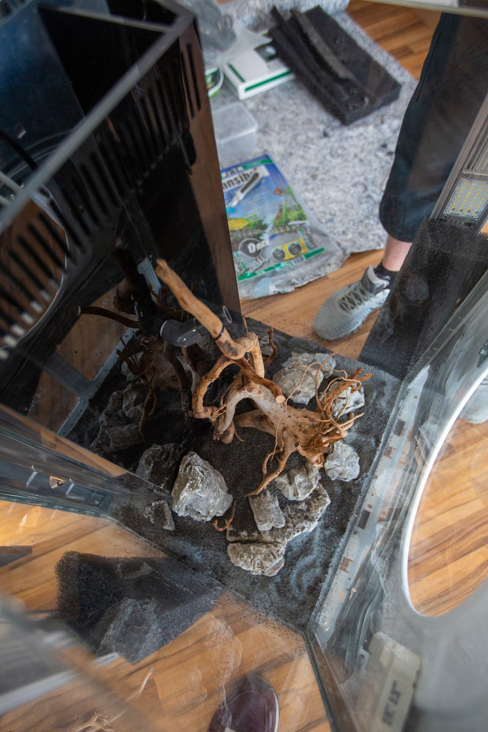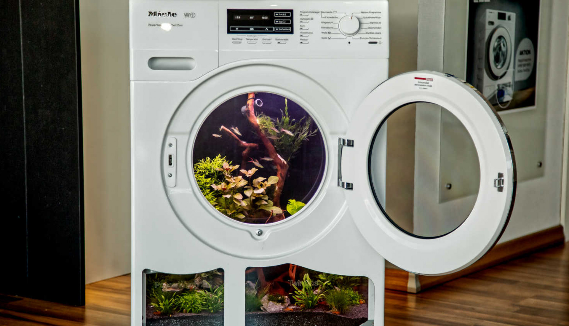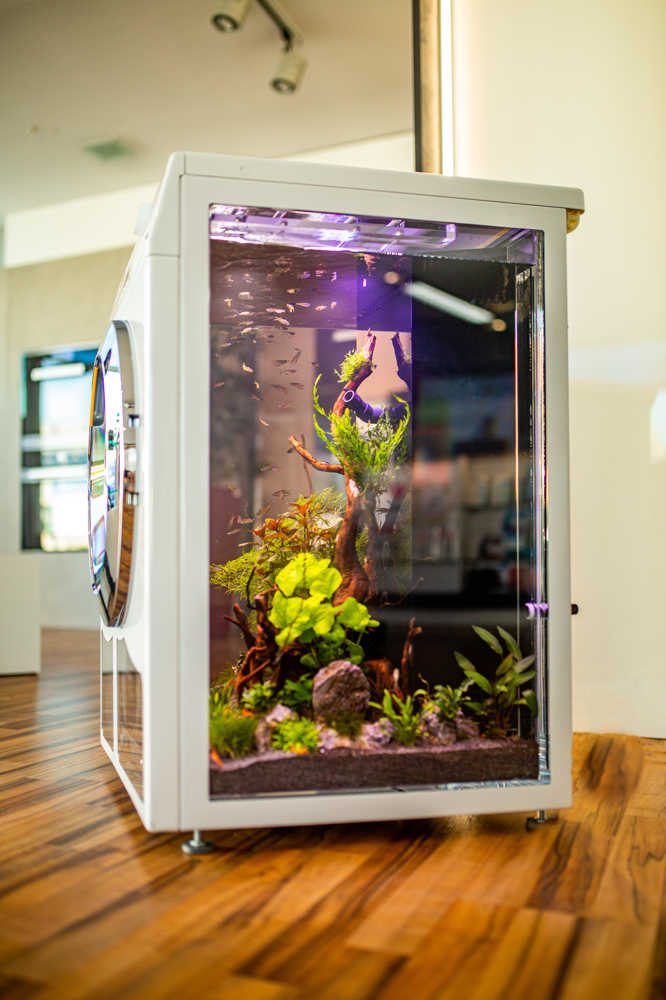 Das Schauaquarium in einem Miele-Store in Aachen ist ein wahrer Eyecatcher. Es besticht nicht nur durch seine Optik, sondern ebenso durch seine hohe Funktionalität. Ein integrierter Innenfilter und Aquarienbeleuchtung sorgen für eine ausreichende Filterleistung. Die Unterwasserwelt besteht aus neun verschiedenen Wasserpflanzenarten und einer Moosart, die in der Art der Bepflanzung und ihrer zukünftigen Wuchsform und Höhenunterschieden einen Uferbereich simulieren. Diverse natürliche Verstecke und Revierabgrenzungen wurden durch Moorhölzer und Minilandschaftsgestein realisiert.