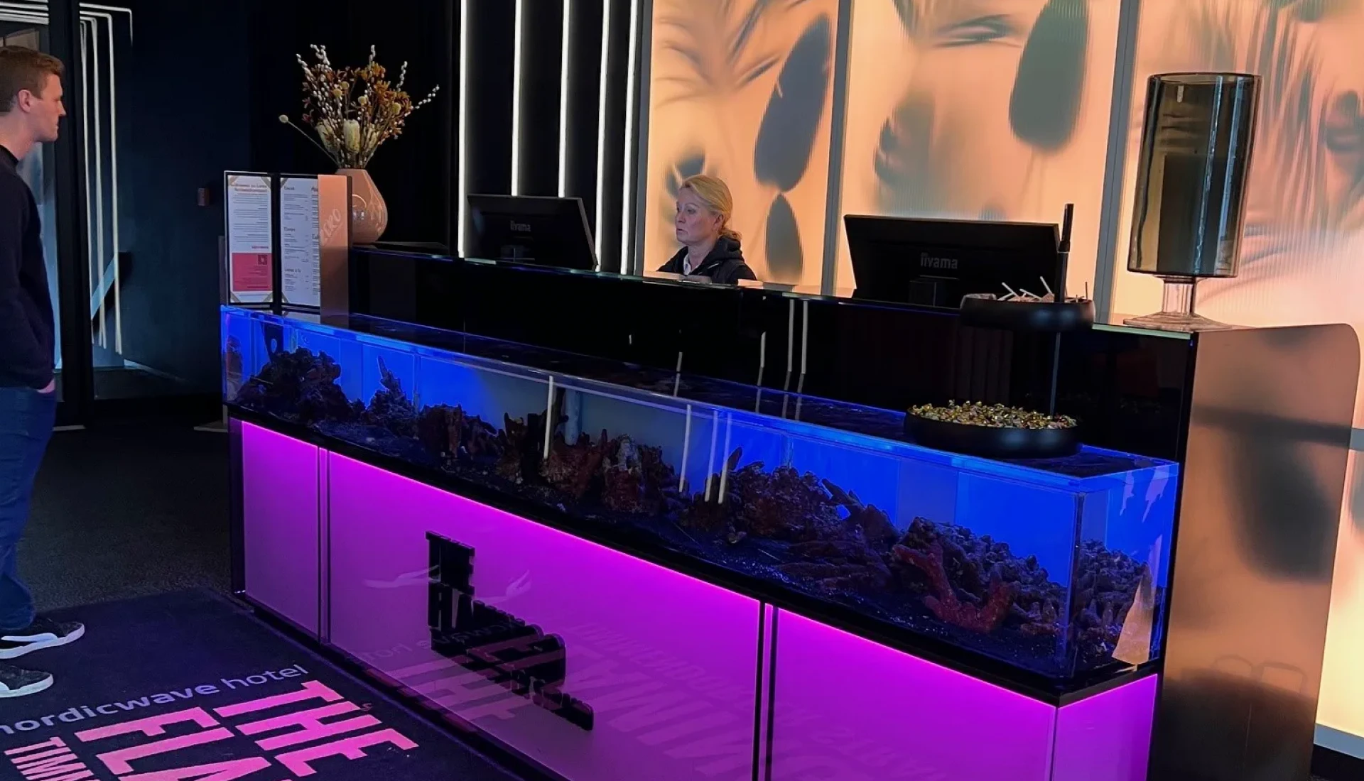 Die Idee eines solchen Aquariums kam dem Besitzer während eines Florida – Urlaubs. Das Design und die Farbwelt wurde in enger Zusammenarbeit mit dem Hamburger Designbüro Joi-Design erarbeitet und von uns umgesetzt. Die Filtertechnik befindet sich im Keller und bietet so einen freien und einfachen Zugang für Wartungsarbeiten.