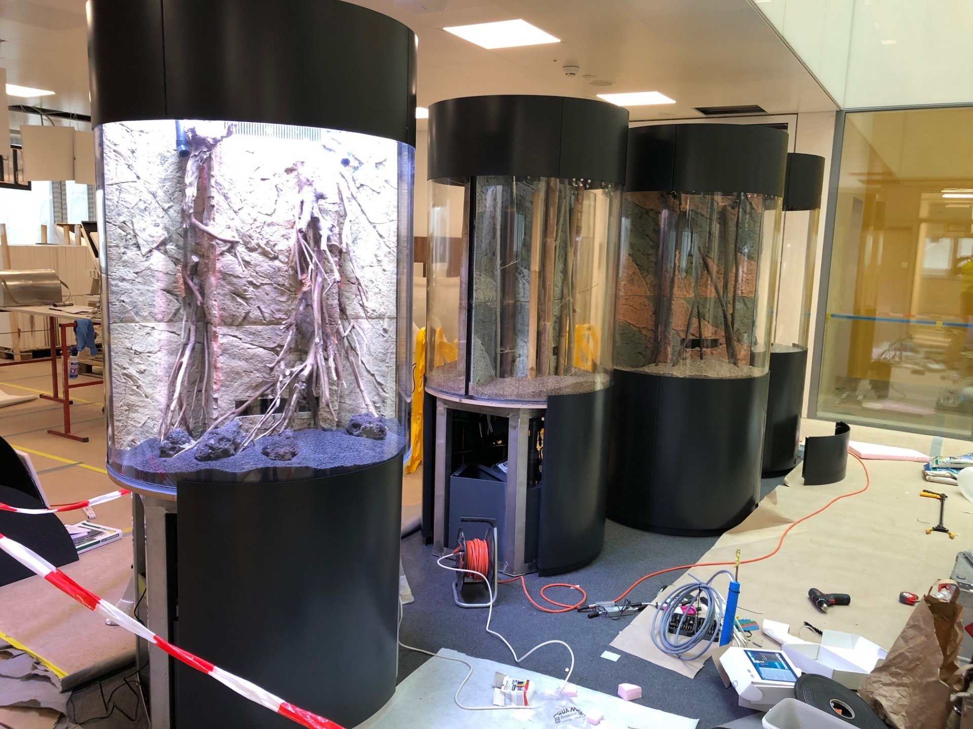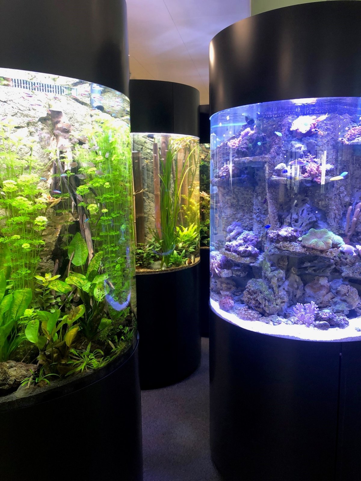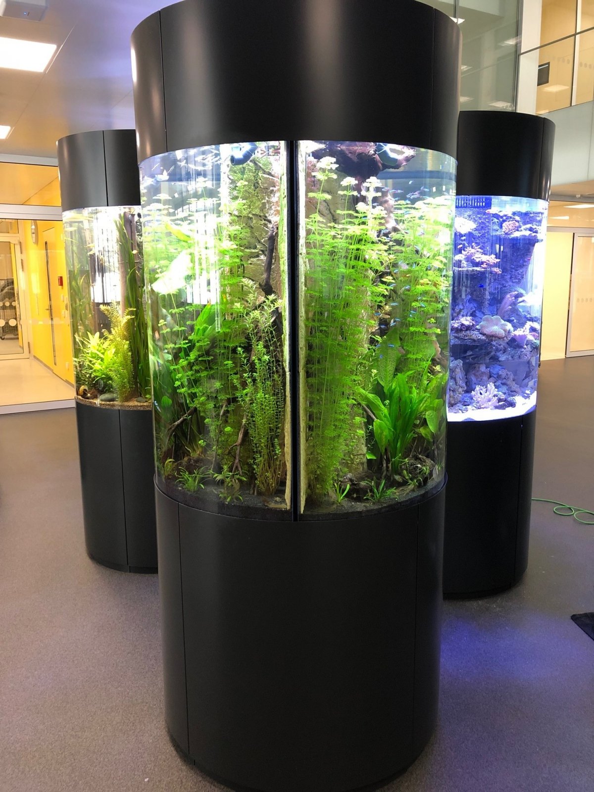 Seit 2019 zeichnet das Bild einer Firmenlobby in Basel fünf Aquarienzylinder mit insgesamt neun unterschiedlichen Lebensräumen. Vier der Aquariensäulen sind nämlich mittig getrennt und beinhalten somit jeweils zwei unterschiedliche Süsswasserhabitate. Ein fünfter Zylinder beheimatet ein tropisches Riff.