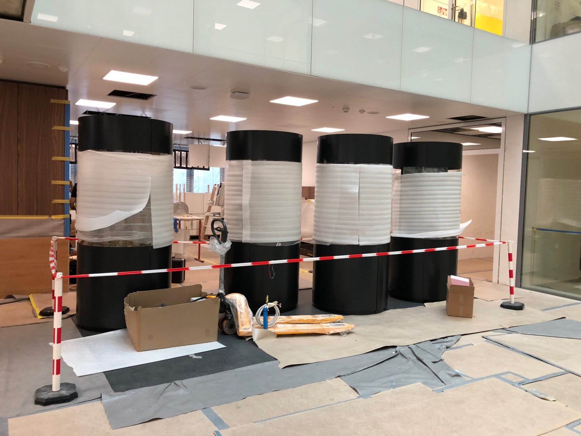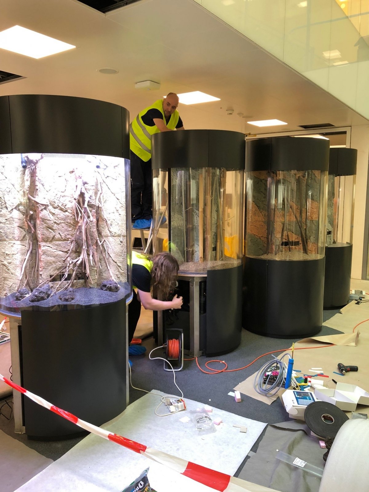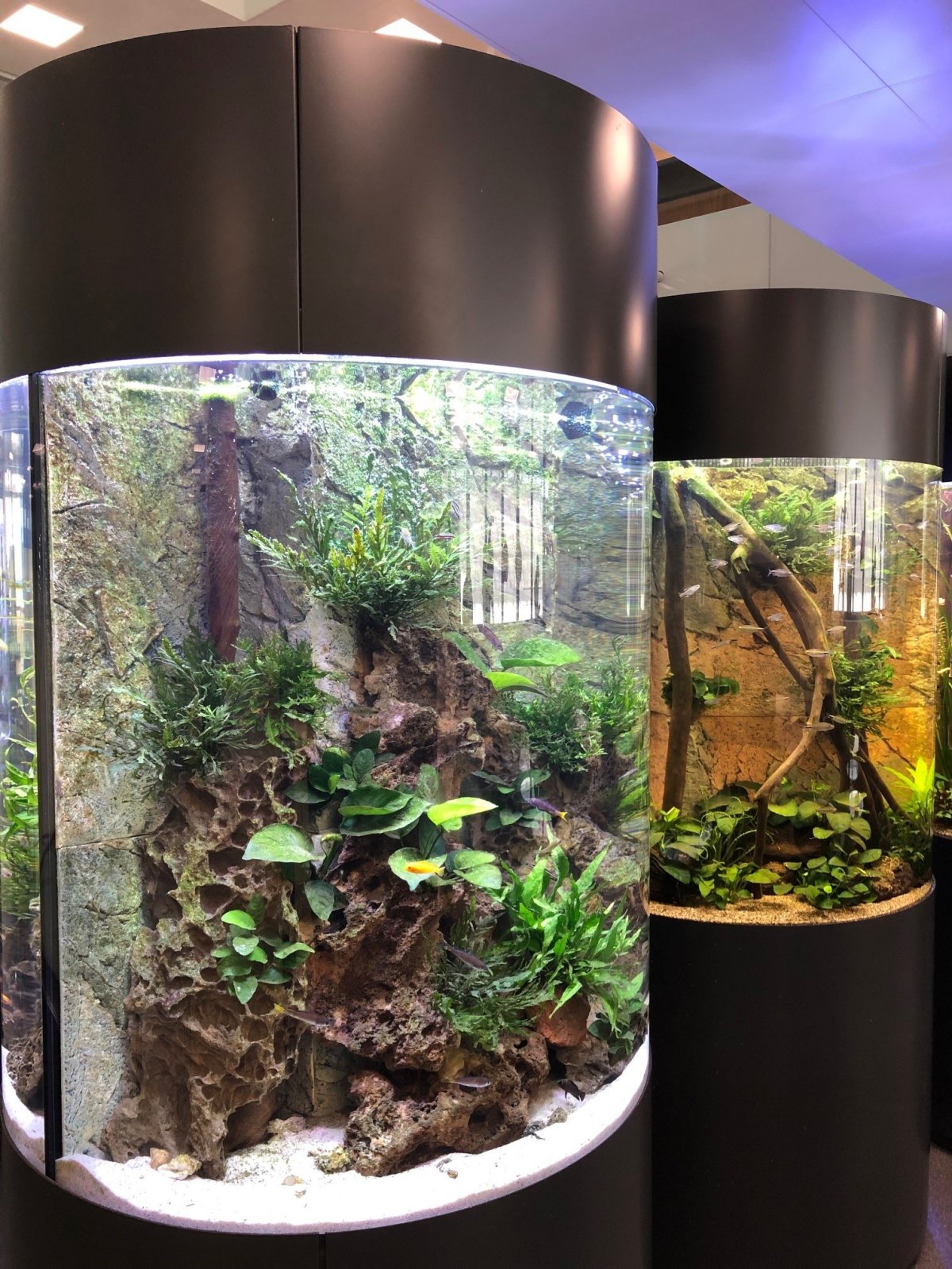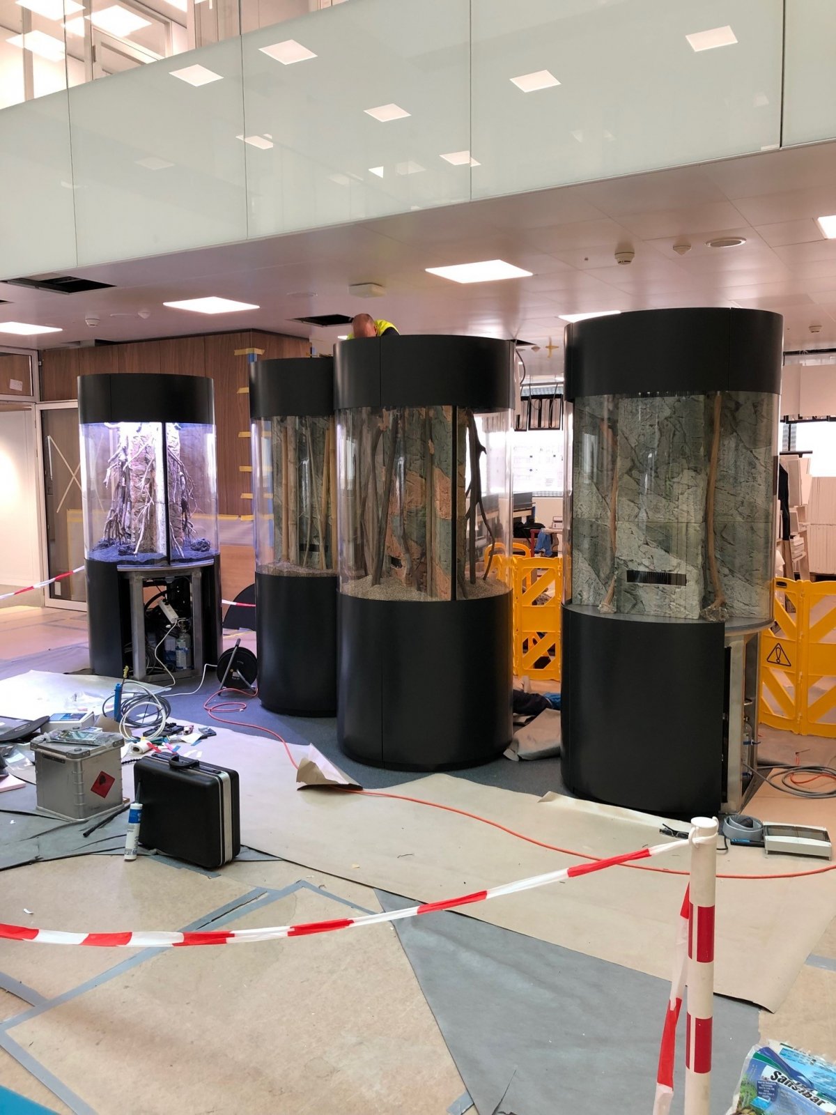 Seit 2019 zeichnet das Bild einer Firmenlobby in Basel fünf Aquarienzylinder mit insgesamt neun unterschiedlichen Lebensräumen. Vier der Aquariensäulen sind nämlich mittig getrennt und beinhalten somit jeweils zwei unterschiedliche Süsswasserhabitate. Ein fünfter Zylinder beheimatet ein tropisches Riff.