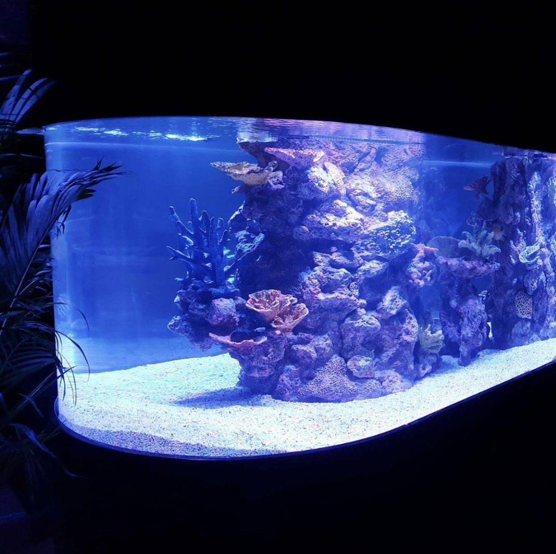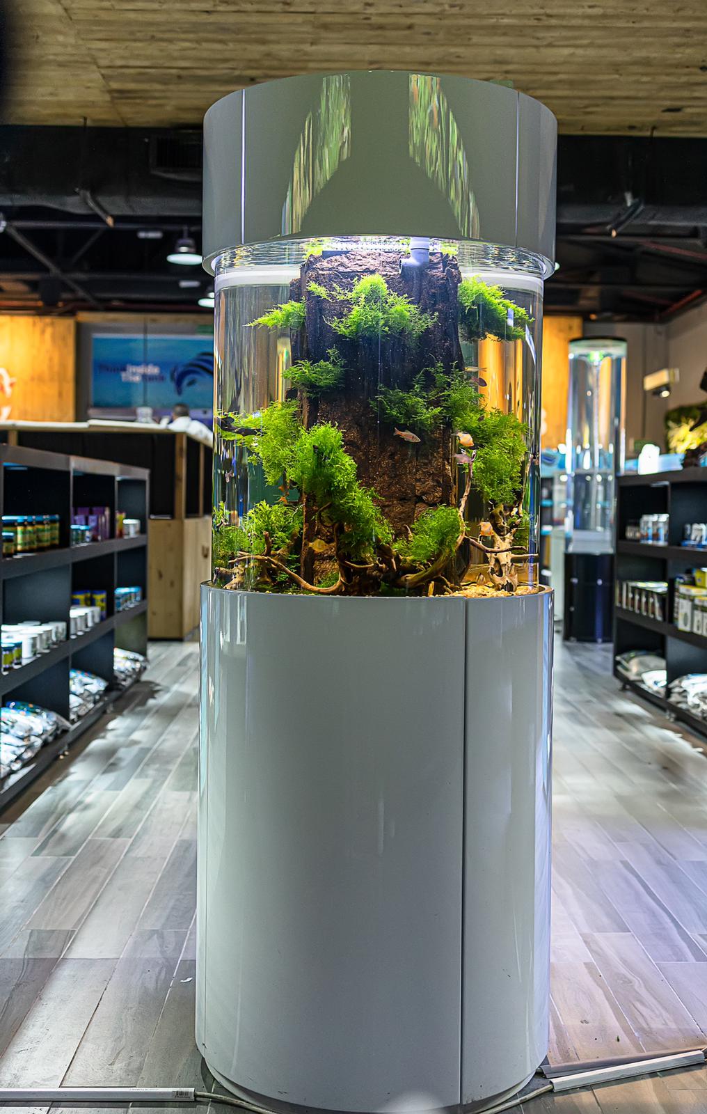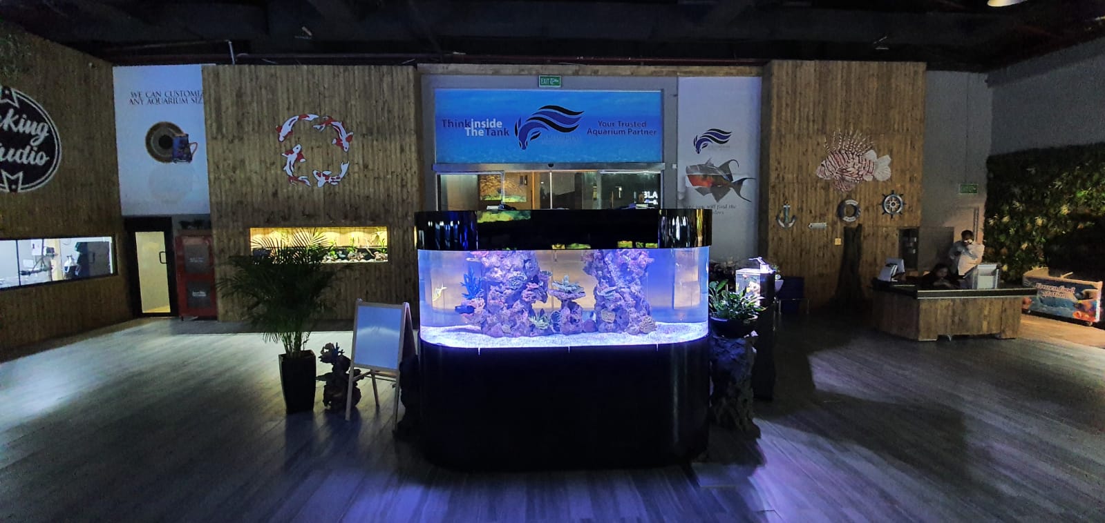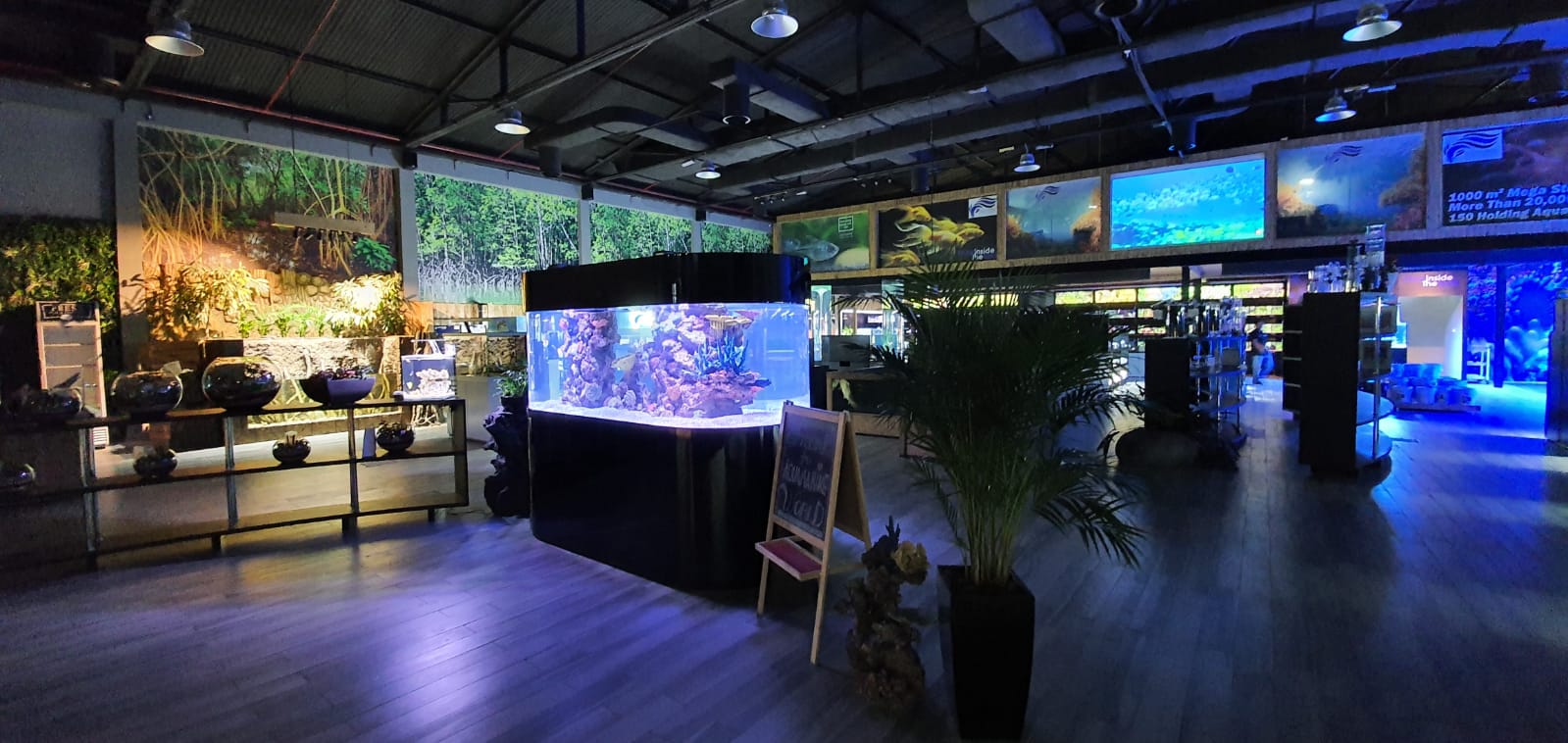 This project allowed us to collaborate with our friends and partners www.aquamarineexotic.com on their new aquatics megastore in the heart of Kuwait City and engage in all aspects of aquarium design. The project included a 400-litre freshwater cylinder aquarium, a bespoke 2500-litre seawater aquarium integrated into an exclusive designer unit, a steel-reinforced GFRP aquarium with front glazing consisting of a 60-mm-thick acrylic panel, an artificial mangrove rear wall and two 2-m-high water features.