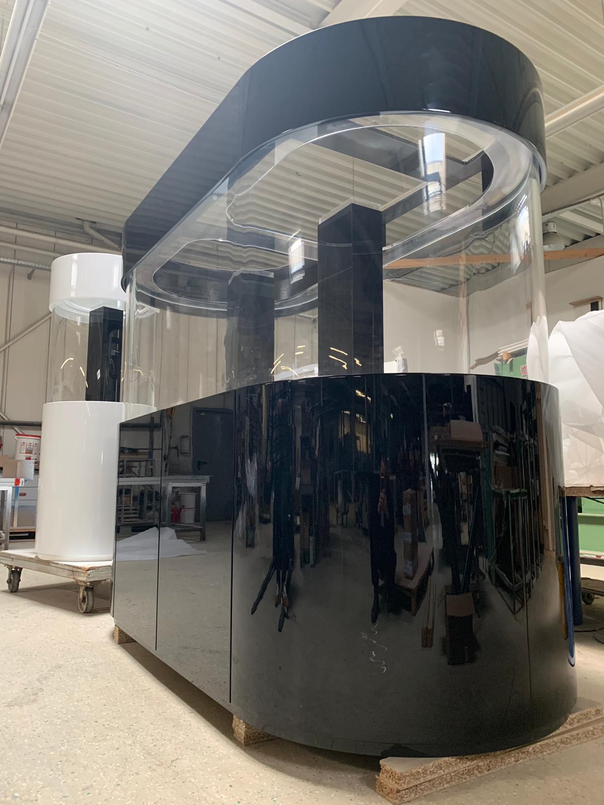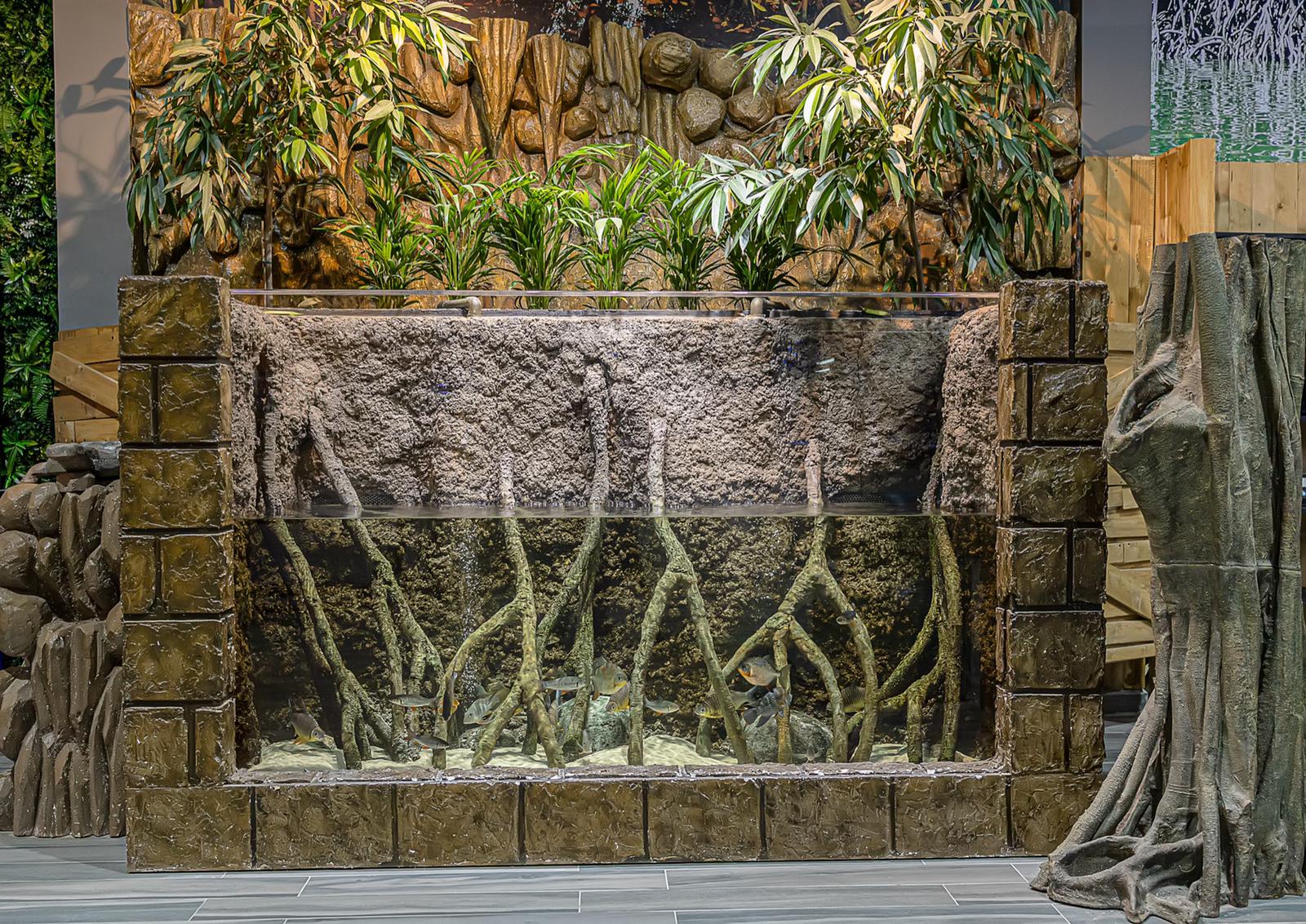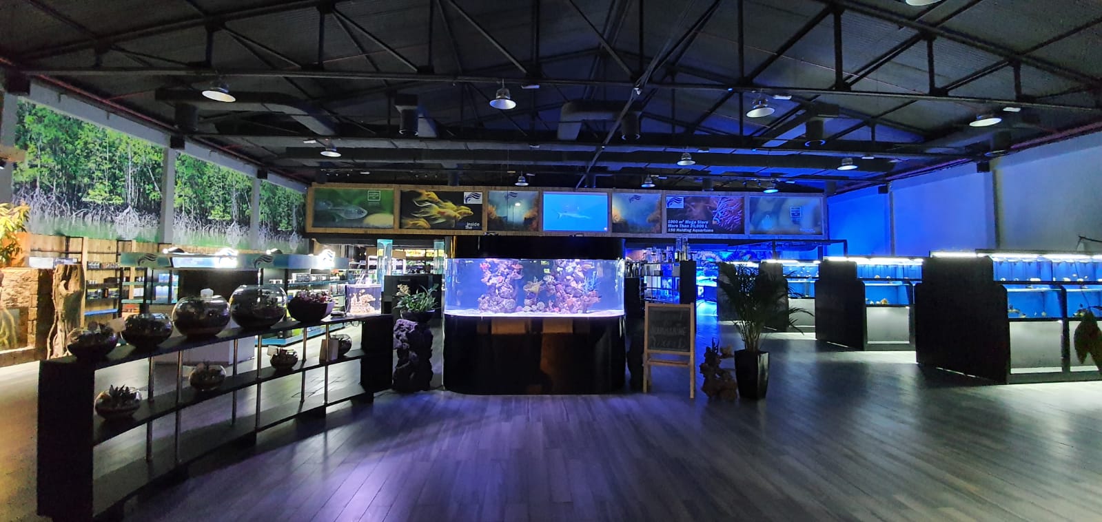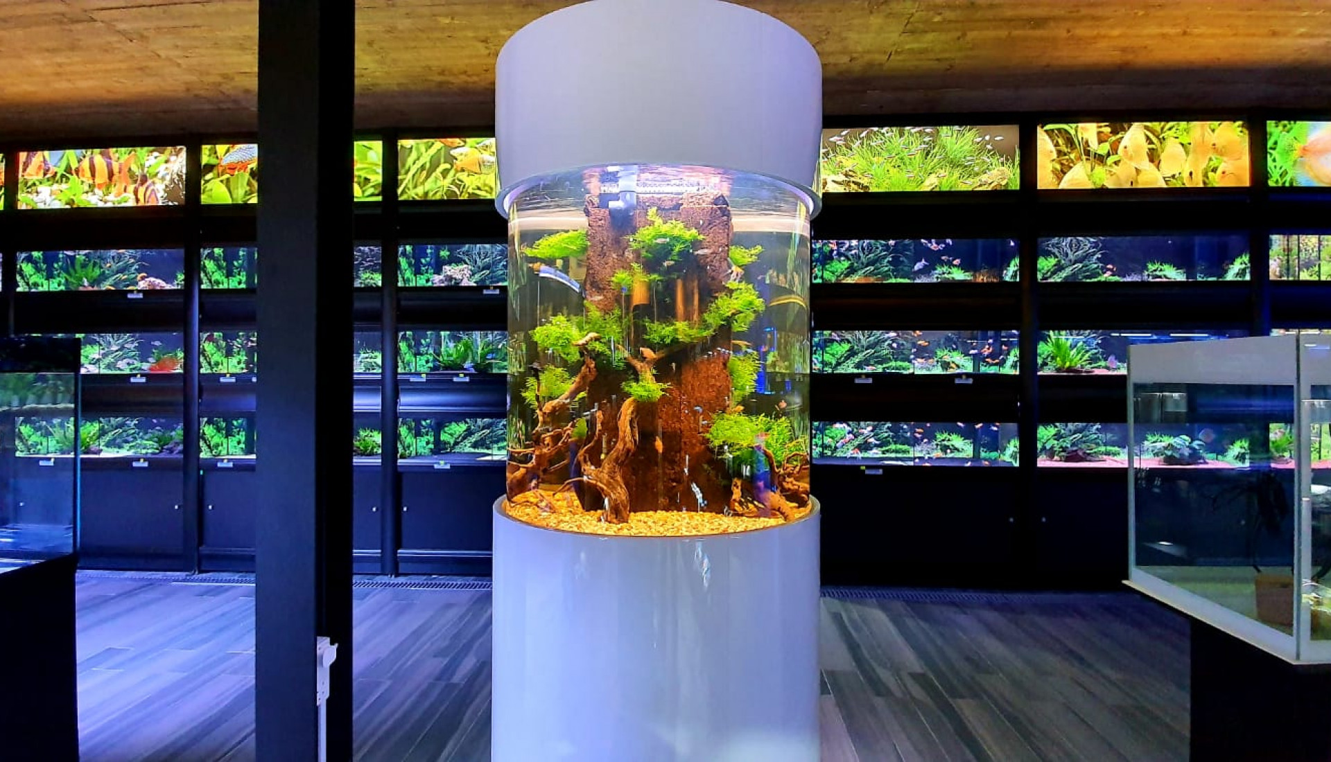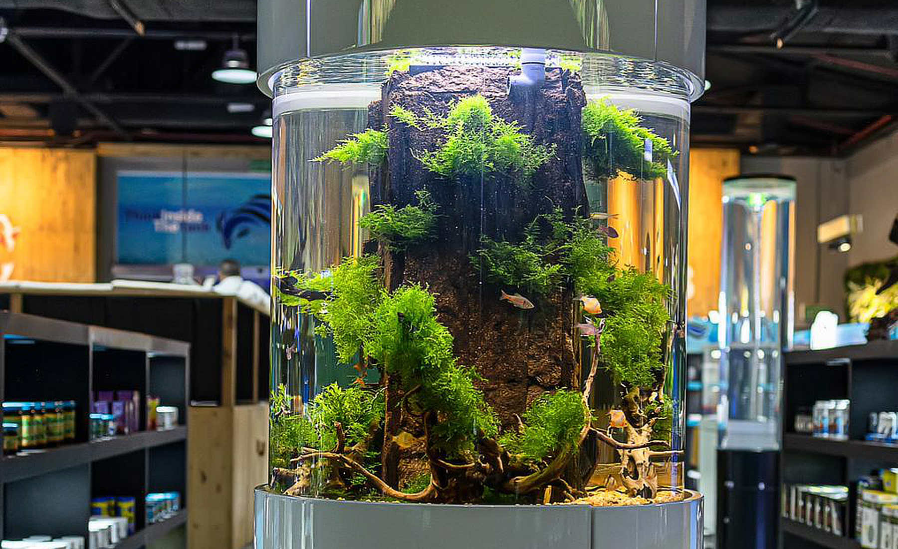 This project allowed us to collaborate with our friends and partners www.aquamarineexotic.com on their new aquatics megastore in the heart of Kuwait City and engage in all aspects of aquarium design. The project included a 400-litre freshwater cylinder aquarium, a bespoke 2500-litre seawater aquarium integrated into an exclusive designer unit, a steel-reinforced GFRP aquarium with front glazing consisting of a 60-mm-thick acrylic panel, an artificial mangrove rear wall and two 2-m-high water features.